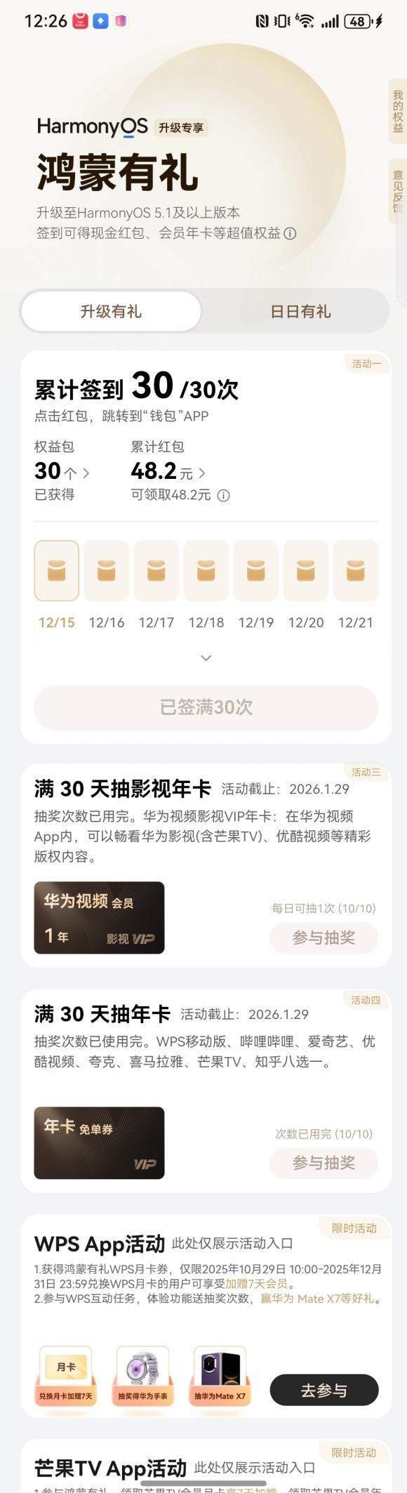 活动的玩法也非常简单,首先,每天去活动页面签到打卡,就能领取现金红包或者华为音乐、阅读等各类权益,积少成多也是肉。首次签到30天后还能参与影视VIP年卡礼包的抽奖,包含一年的华为影视会员+优酷小屏会员!