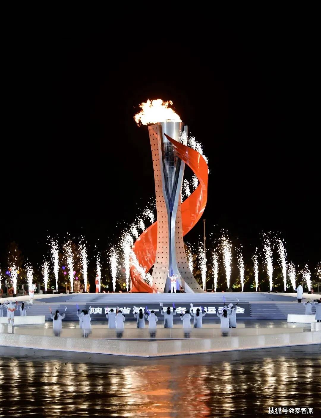 分会场榆林水上运动中心,夜空被焰火秀和无人机表演点亮,主火炬前则是横山腰鼓、忠勇杨家鼓等陕西特色表演。